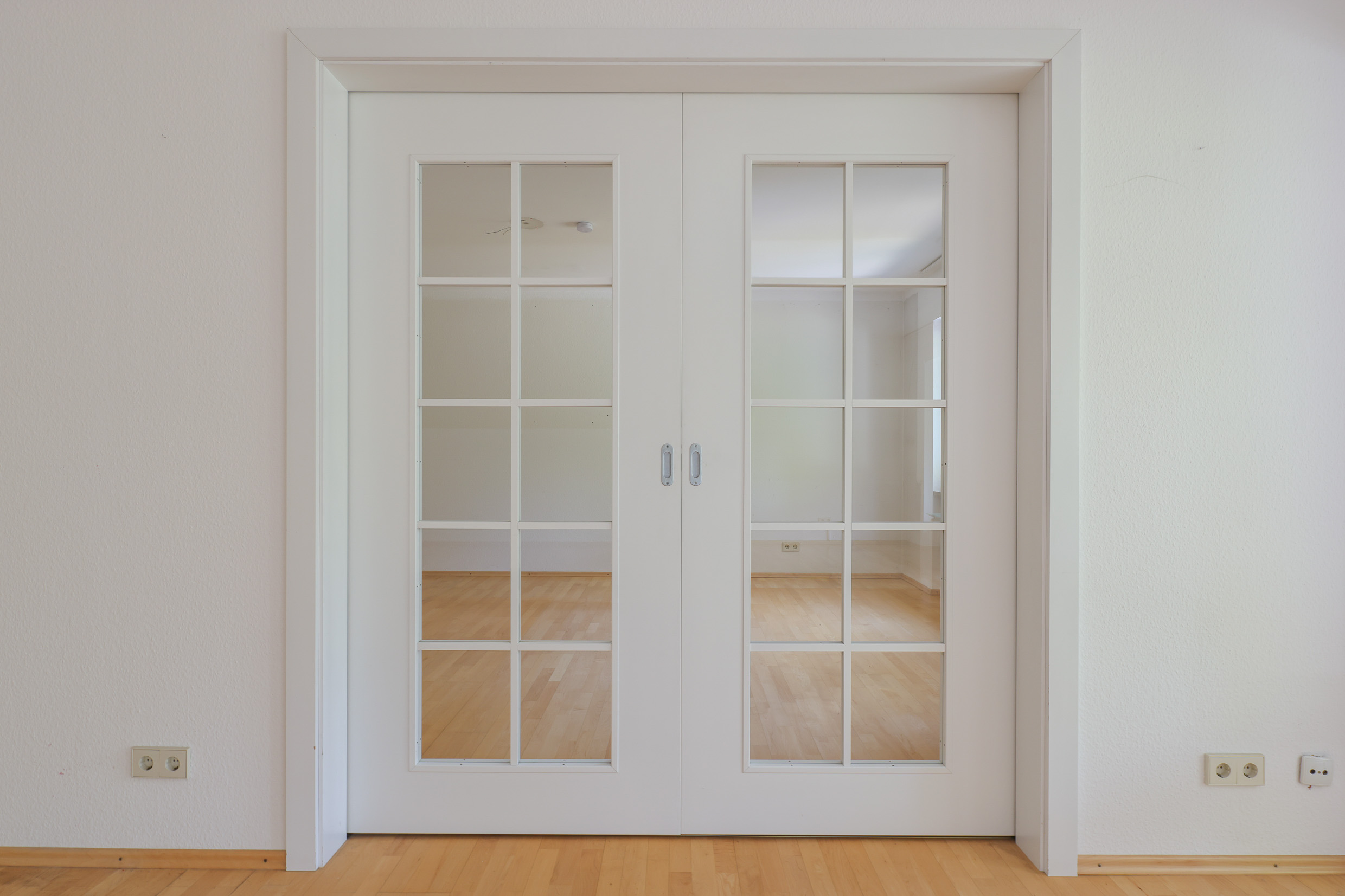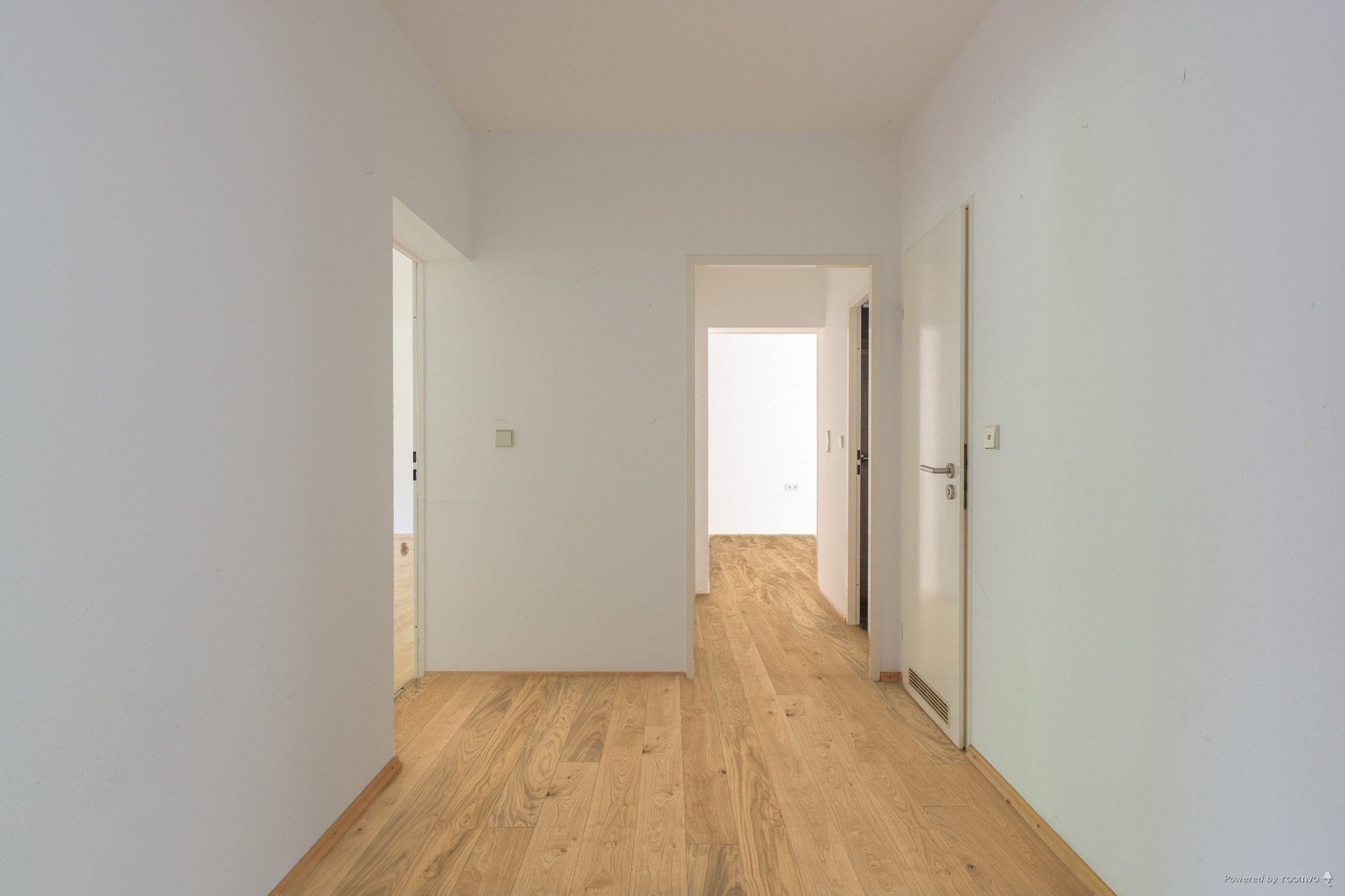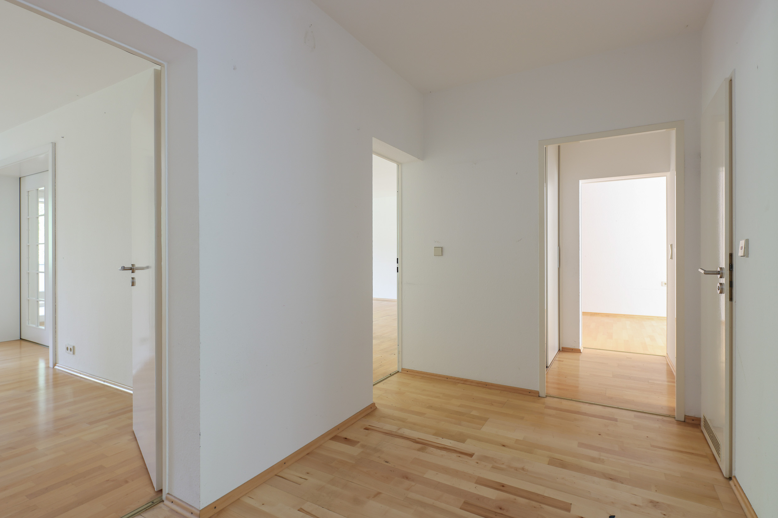 man den Eingangsbereich. Von einem breiten Flur gehen rechts und links die Wohnräume ab. Ein großes Arbeitszimmer mit Blick in