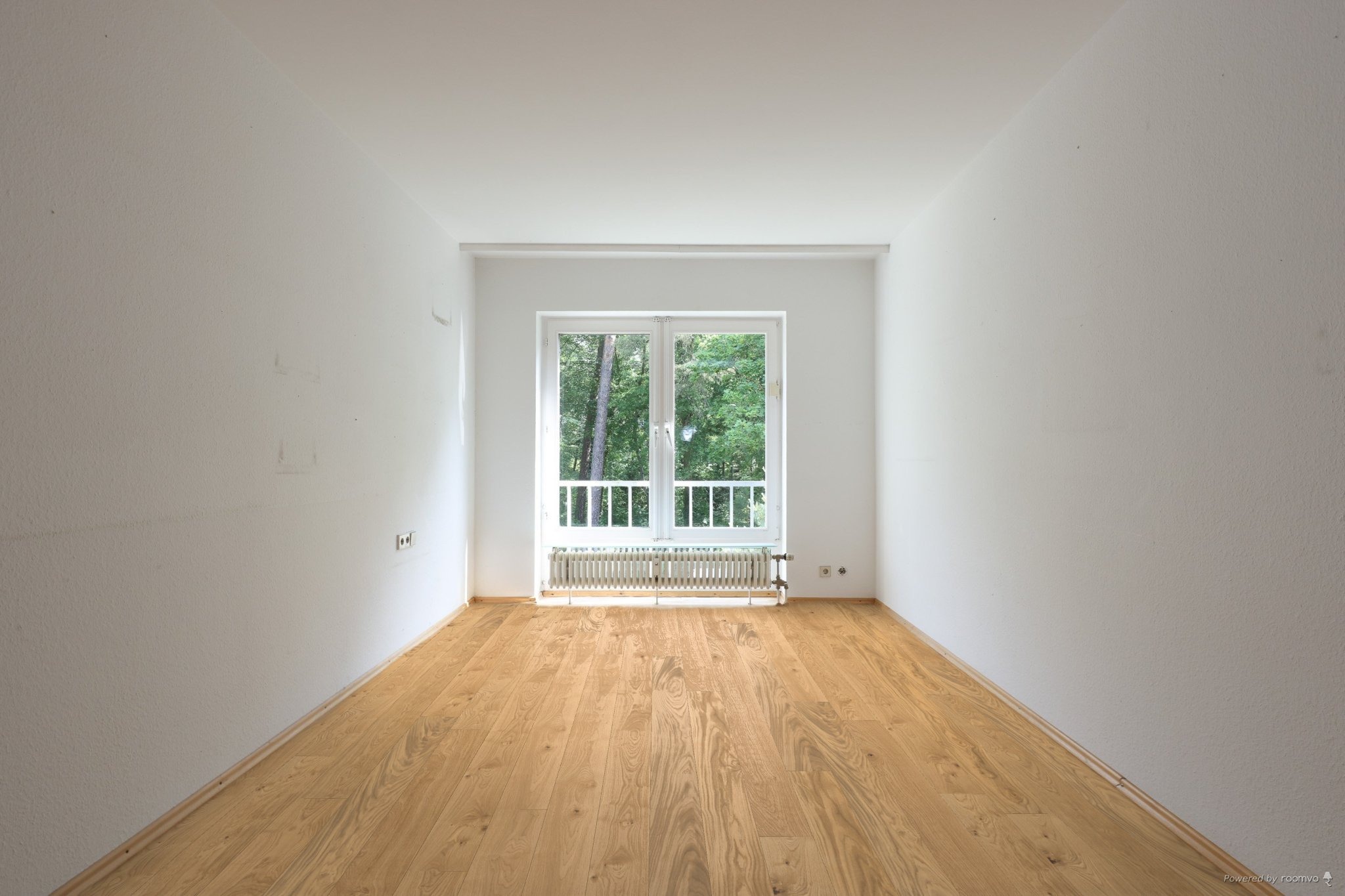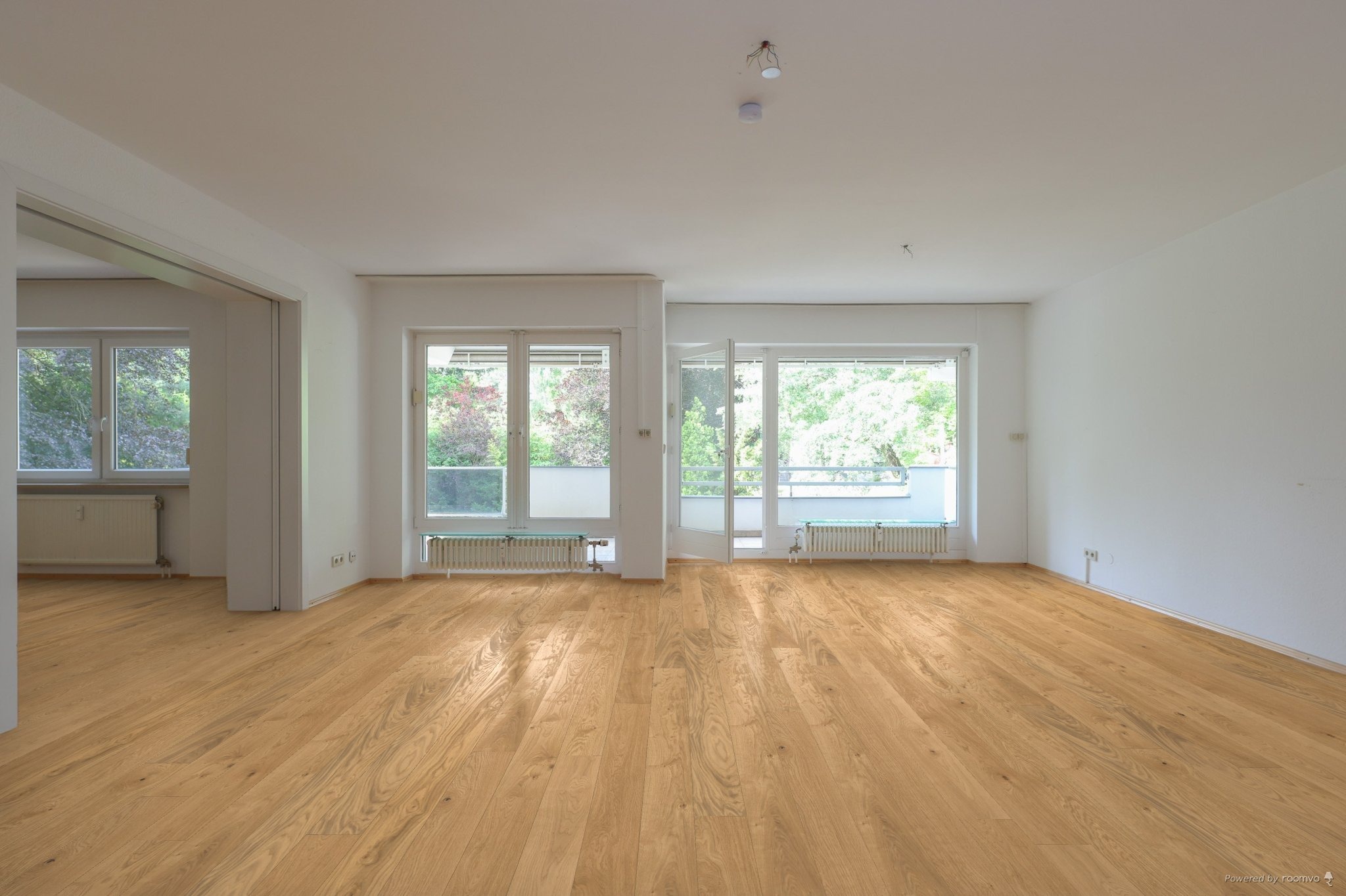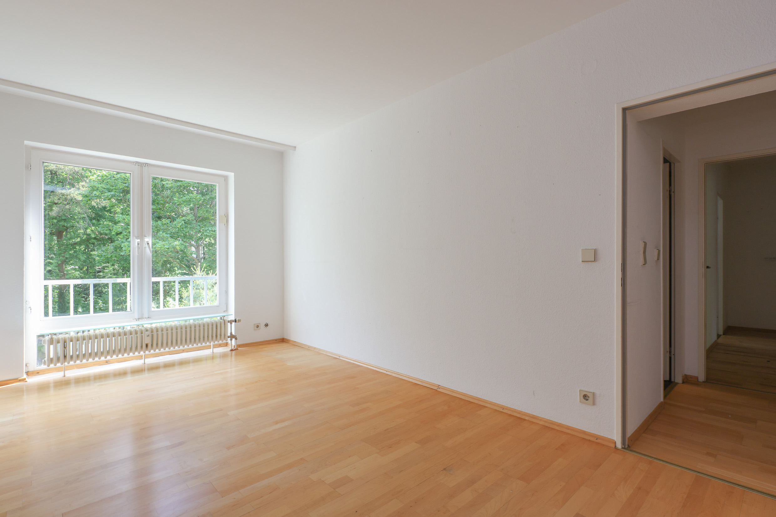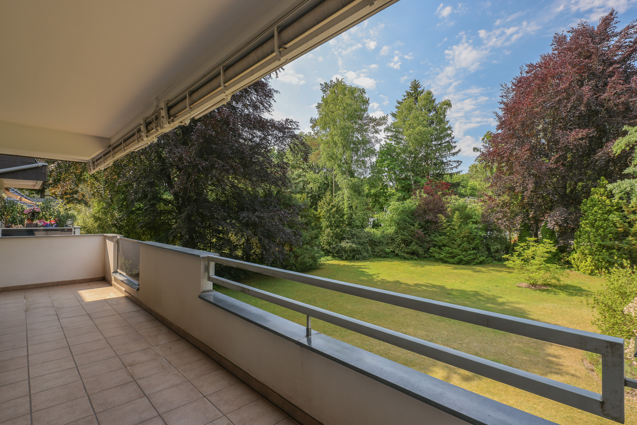 den herrlichen Garten ist mit einer edlen Holz-Glas-Schiebetür mit dem großzügigen Wohn-Esszimmer verbunden. Von hier hat man ebenfalls einen wunderschönen Blick in den Park ähnlichen Garten. Beide Räume sind sehr hell und lichtdurchflutet. Ein großer Balkon erstreckt sich entlang der gesamten Länge dieser beiden Räume und bietet ausreichend Platz für einen Gartentisch, Stühle und eine Sonnenliege. Eine elektrische Sonnenmarkise schützt vor zu viel Sonne. Elektrische Jalousien sind vorhanden. Dank der Südwestausrichtung