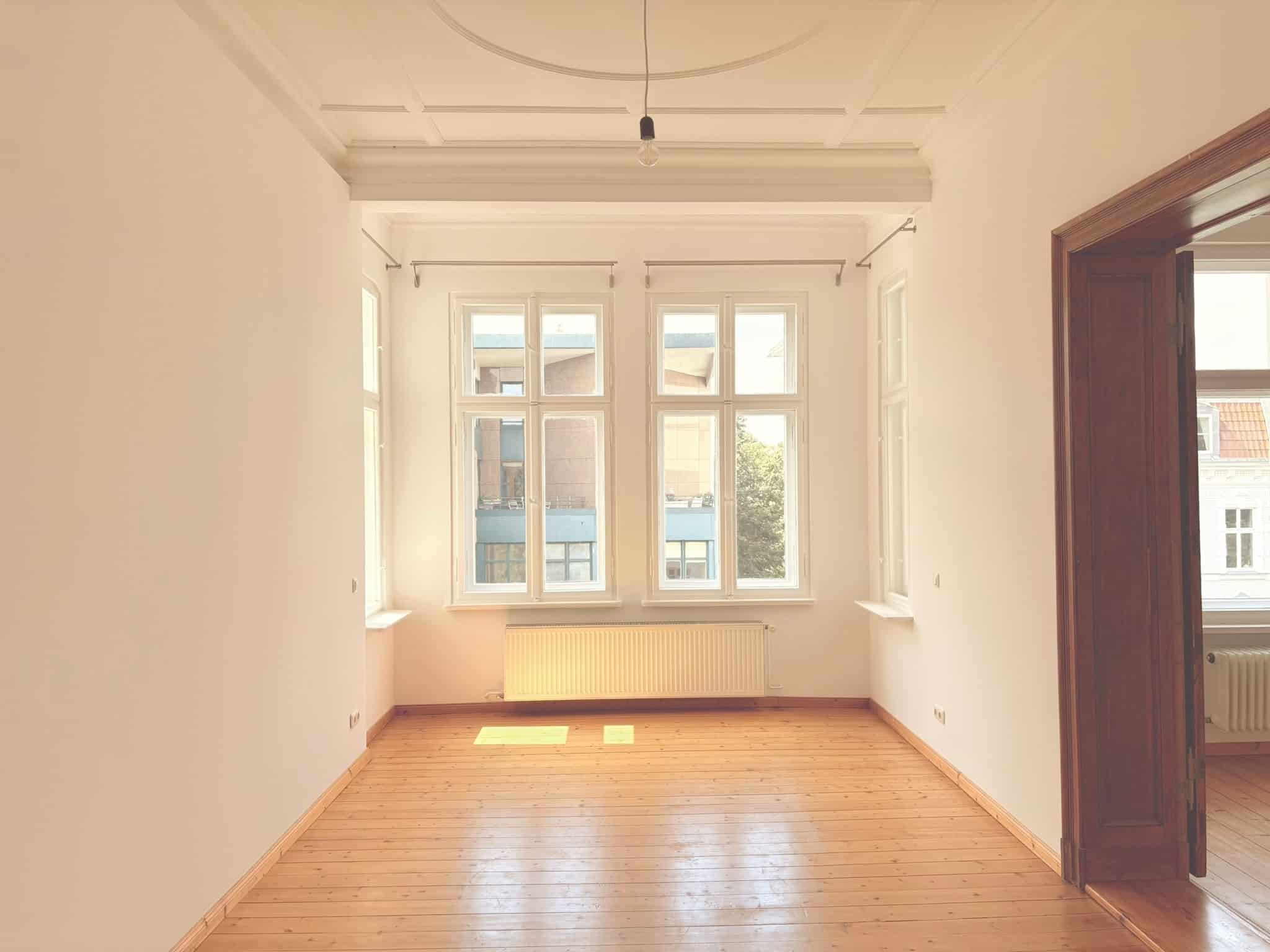 Die frisch renovierte 3 Zimmer Wohnung mit großem, praktischen Eingangsflur befindet sich im 3. Obergeschoss eines Jugendstilgebäudes aus dem Jahr 1903. Die Wohnung verfügt über eine Wohnfläche von ca. 98 m². Die Raumhöhe beträgt über 3 m. Die Ausstattungsmerkmale einer klassischen Jugendstilwohnung aus der Zeit der Jahrhundertwende sind vorhanden: Dielen Fussboden, Doppel-Kastenfenster, Stuck und stilvolle Holztüren in den Räumen. Die Wohnung ist sehr gepflegt und mit hochwertigen, modernen Geräten ausgestattet. Alle Wände sind gespachtelt. Die gesamte Wohnung wird über eine Gas-Etagenheizung beheizt. Zwei Zimmer sind mit einer großen Flügeltür miteinander verbunden. Ein charmanter Balkon, der Platz für zwei Personen bietet, erstreckt sich vor einem der Zimmer und lädt an lauen Sommerabenden zum entspannten Verweilen ein. In der Küche ist genügend Platz für einen Esstisch, neben den modernen Einbauschränken, Induktionsherd mit Backofen, Gasherd, Mikrowelle. Das moderne Bad mit großem Fenster ist mit einer Badewanne, Dusche, WC und einem großen Waschtisch mit Spiegel ausgestattet und entspricht allen Ansprüchen des modernen Wohnens.
