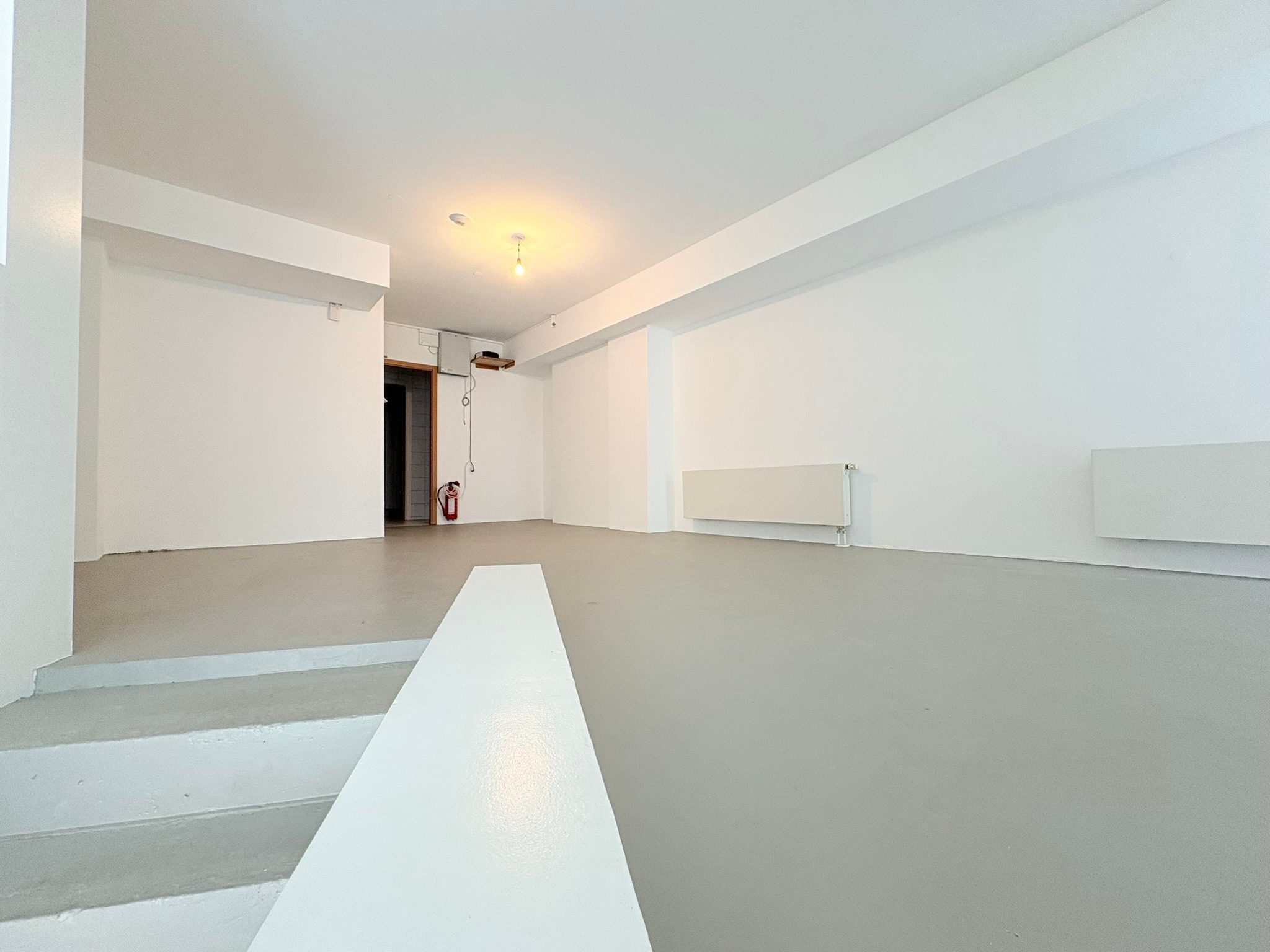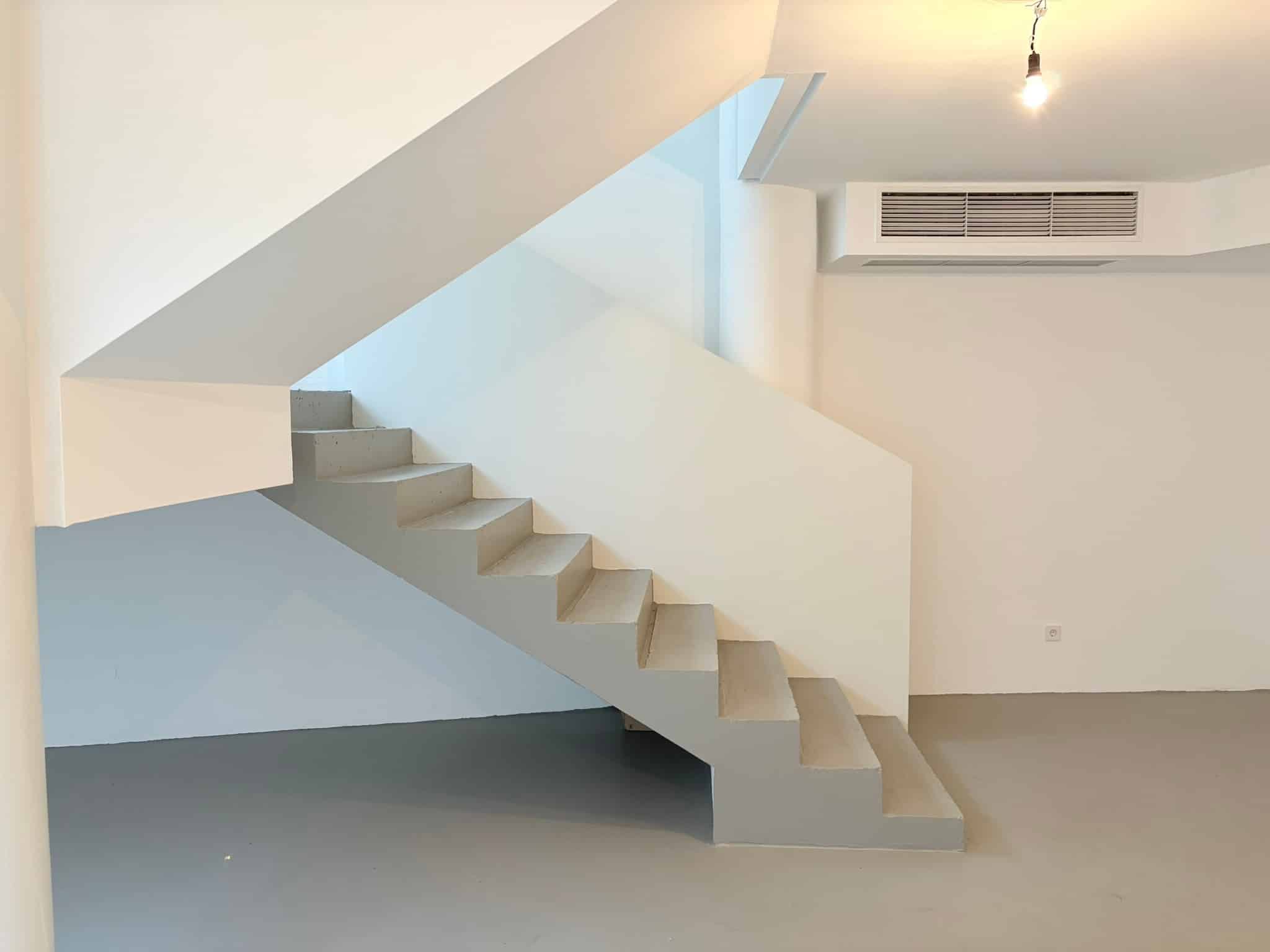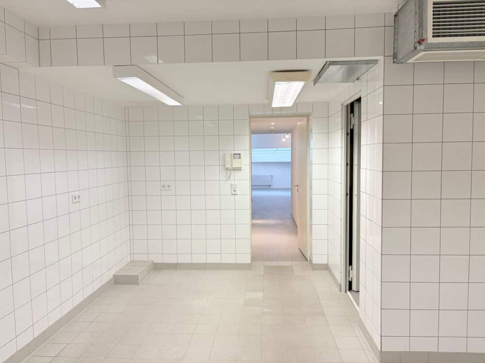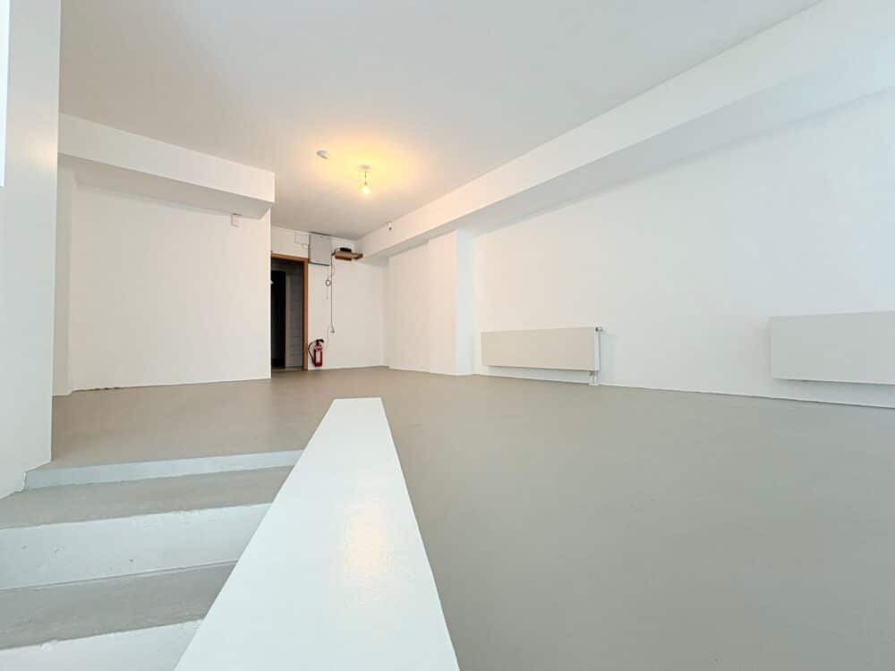 Die untere Ebene bietet mit rund 40 m² ebenfalls einen großen, offenen Raum, der vielseitig nutzbar ist – etwa als Arbeits-, Behandlungs- oder Ausstellungsfläche. Im hinteren Bereich schließt sich ein weiterer Raum an, der ursprünglich als Küche konzipiert war und flexibel als Aufenthalts-, Lager- oder Werkraum genutzt werden kann. Zwei kleinere Nebenräume bieten zusätzlichen Platz für Lager, Technik oder Archiv. Auch auf dieser Ebene befindet sich ein separates Bad mit Toilette und Waschtisch.